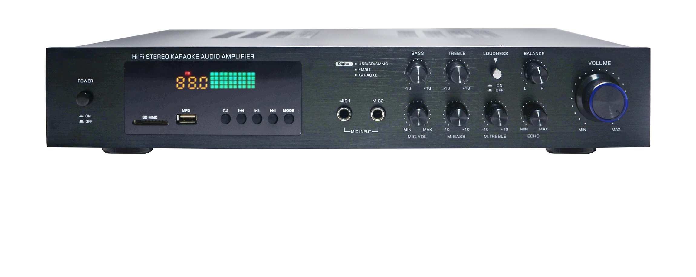 BOFMANN MP 320, güçlü 300 watt toplam çıkış gücüyle yüksek performans sunan stereo amplifikatördür. 2 kanal olarak 150W+150W çıkış sağlar ve 4-16Ω empedans aralığını destekler. Bluetooth özelliği sayesinde kablosuz müzik keyfi yaşatır.