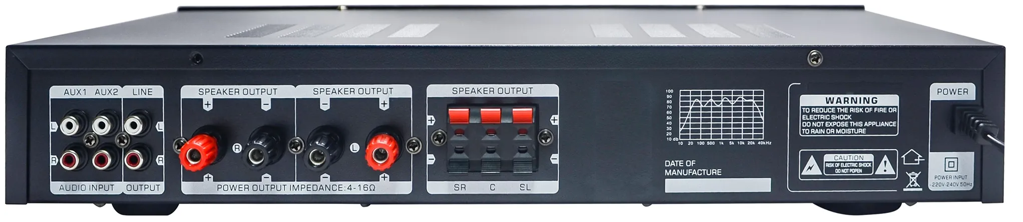 220V AC güç kaynağı ile çalışır ve 10Hz-50KHz frekans cevabı sayesinde net ses kalitesi sunar.