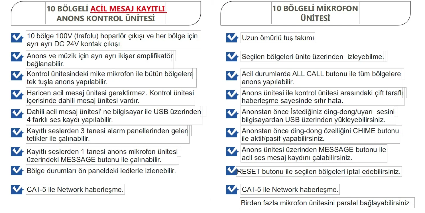 10 ayrı bölgeye tek tek ya da tümüne aynı anda anons yapabilme imkânı sunar. Üzerindeki dahili mikrofon ile hızlı anonslar yapılabildiği gibi, kontrol ünitesine Ethernet (CAT-5) bağlantısı üzerinden entegre edilerek çok katlı binalar, alışveriş merkezleri, fabrikalar, oteller ve kurumsal tesislerde güvenli bir çözüm sağlar.