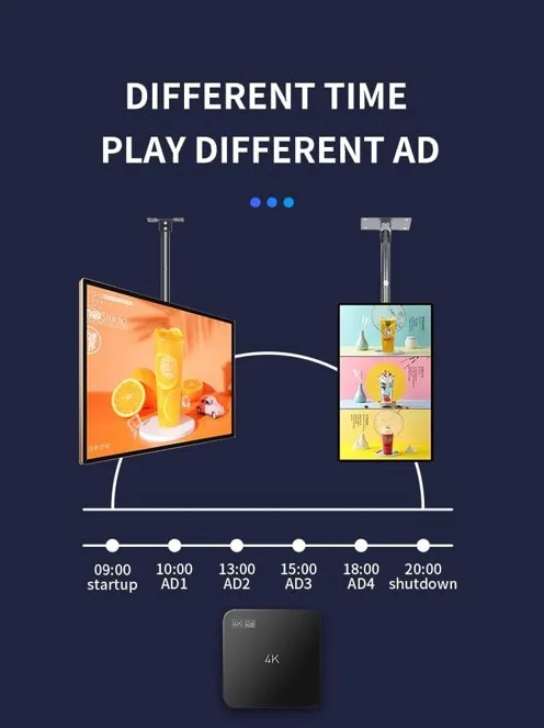Dünya üzerinde bulunan bütün şubelerinizdeki ekranlarda oynatılacak reklam video veya görsellerini, web server' da kurulu bulunan programımız aracılığı ile tek merkezden yönetebilirsiniz.Reklam video veya görsellerinizi hazırlayıp, programa yükledikten sonra, haftanın hangi günlerinde hangi saat aralıklarında hangi videoların oynatılacağını seçebilirsiniz. Ekranlarınızı yatay veya dikey olarak kullanabilirsiniz. Cihazı istediğiniz günlerde istediğiniz saatte başlatıp istediğiniz saatte durdurabilirsiniz.